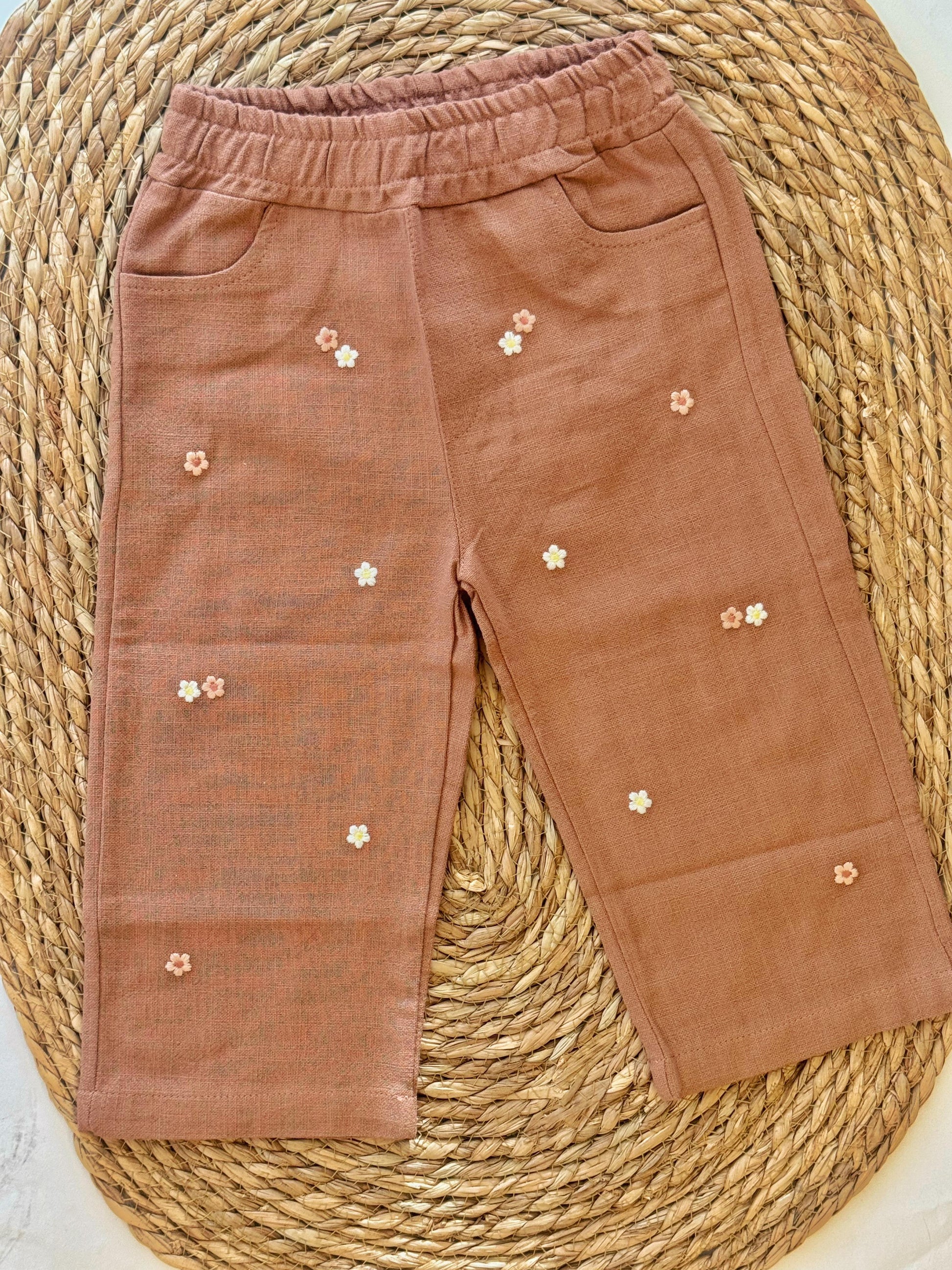 Brown Linen Pants with flower embroidery